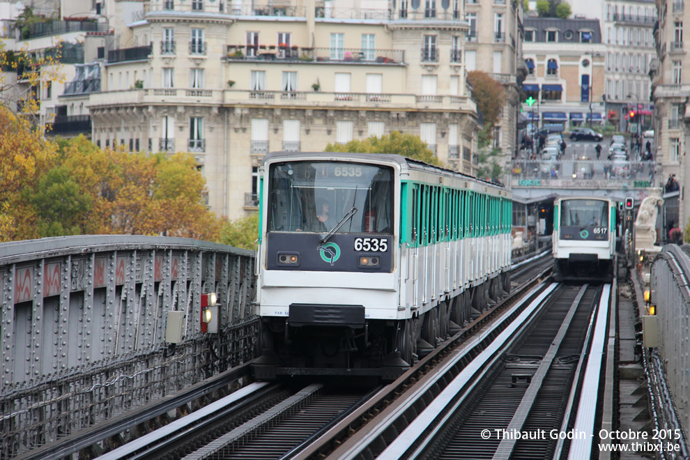 Métros 6535 et 6517 sur la ligne 6 (RATP) à Bir-Hakeim (Paris)